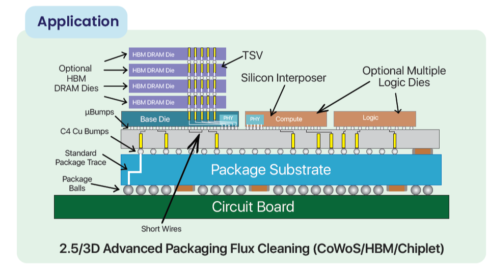 主要应用于大批量生产的SIP、 FCCSP、FCBGA、及先进封装PCBA焊接后的清洗。支持全自动清洗方案系统,搭配上下料系统使用。对各种键合、焊接加工工艺过程中残留的助焊剂、空气粉尘颗粒或其他杂质污染进行高效清洗。清洗后产品能够达到表面洁净,完全无助焊剂、油污脏污等杂质污染物残留的效果,效果符合多种封装制程洁净度要求,符合半导体高端精密制程要求。